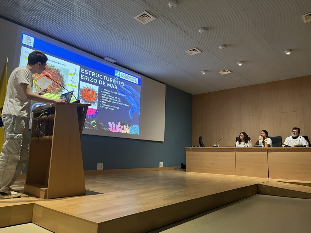 La Facultad de Ciencias del Campus Universitario de Puerto Real ha acogido una sesión presidida por el vicedecano de Estudiantes y Relaciones Internacionales de la Facultad de Ciencias del Mar y Ambientales de la UCA, Alejandro Centeno, quien ha destacado lo positivo de abrir las facultades a jóvenes próximos al acceso a la universidad: “Estoy impresionado de que toméis una actitud activa y vayáis a presentar vuestros propios resultados”. Junto a él, han tomado asiento en la mesa presidencial José Antonio Muñoz Cueto y Ana Belén Tinoco, IP e investigadora de Echinaqua, respectivamente.Ambos han alabado y agradecido la dedicación y el compromiso de los participantes, añadiendo Cueto la relevancia de esta colaboración en su propio proyecto, ya que la actividad se integra como uno de los objetivos de este.