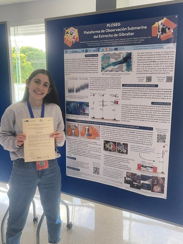 Expuestas como parte de la extensa programación desarrollada durante los tres días de encuentro, 12 de estas presentaciones han correspondido a jóvenes investigadores vinculados a proyectos de investigación científica enmarcados en ThinkInAzul Andalucía. Destacable fue la participación de Irene Nadal, participante del proyecto “ESMER4: Estación de Monitorización del Flujo de agua Mediterránea saliente por el Estrecho de Gibraltar: 4º periodo”, quien ganó el concurso de posters en su línea temática.